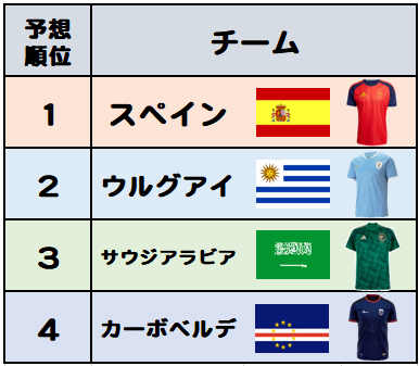 1位:スペイン 2位:ウルグアイ 3位:サウジアラビア 4位:カーボベルデ