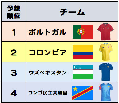 1位:ポルトガル 2位:コロンビア 3位:ウズベキスタン 4位:コンゴ民主共和国